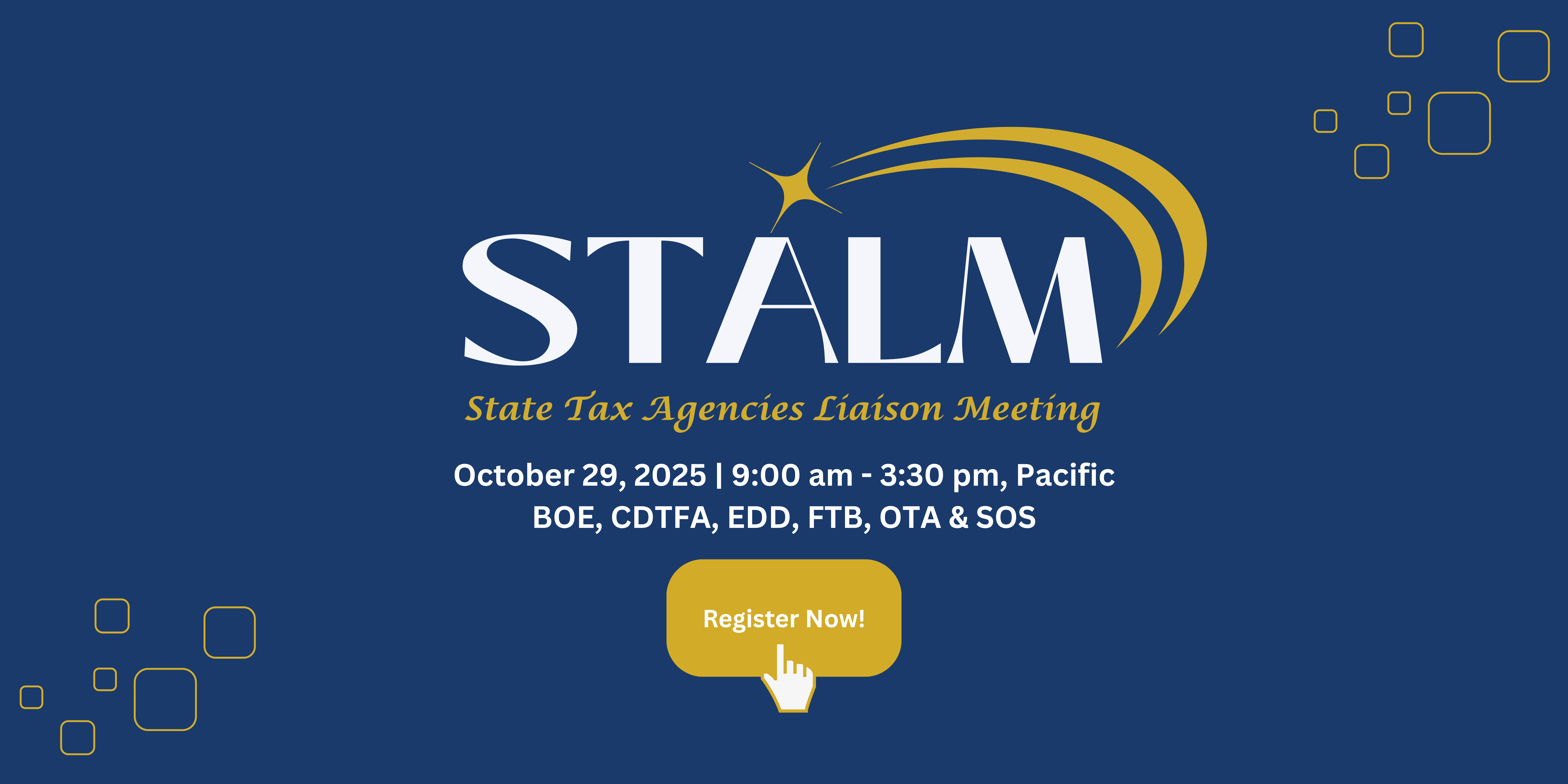STALM is an exclusive Members-only virtual event that provides a unique forum where attendees will hear from high-level representatives from six state agencies -- FTB, EDD, CDTFA, BOE, SOS, and OTA.